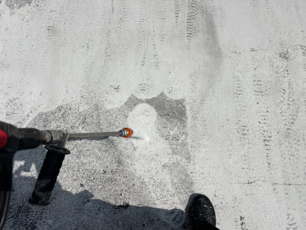 - 施工を始める前にまずは表面の汚れと膨れてしまっている部分を高圧洗浄でしっかりと綺麗にします。汚れを落とす事で新たに防水層を作る際に密着性をよくする効果があります。