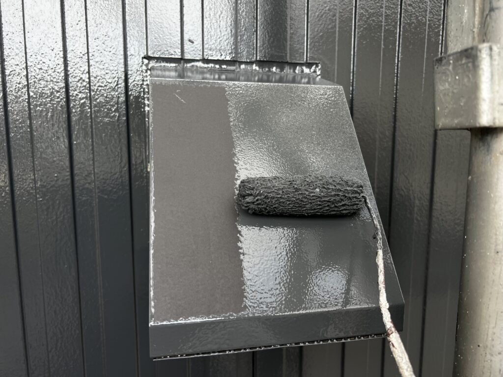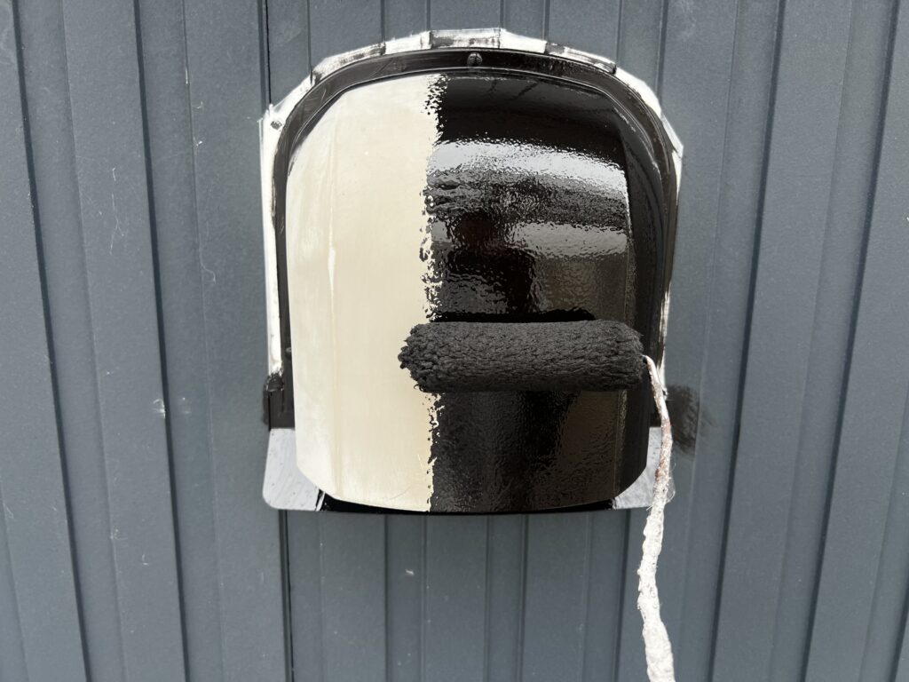 下地処理が終わったら次は下塗り作業になります。今回使用させて頂いた塗料は錆止め&プライマー効果のある材料です。錆を発生しにくくし、上塗り材との密着も良くするための材料です。上塗りの色が濃い色なので黒の下塗り塗料を使用しています。例えば上塗りが明るい色【白やクリーム】の場合は白の下塗り塗料を使用します。そうする事で仕上がりの艶も変わり、発色がよくなります。